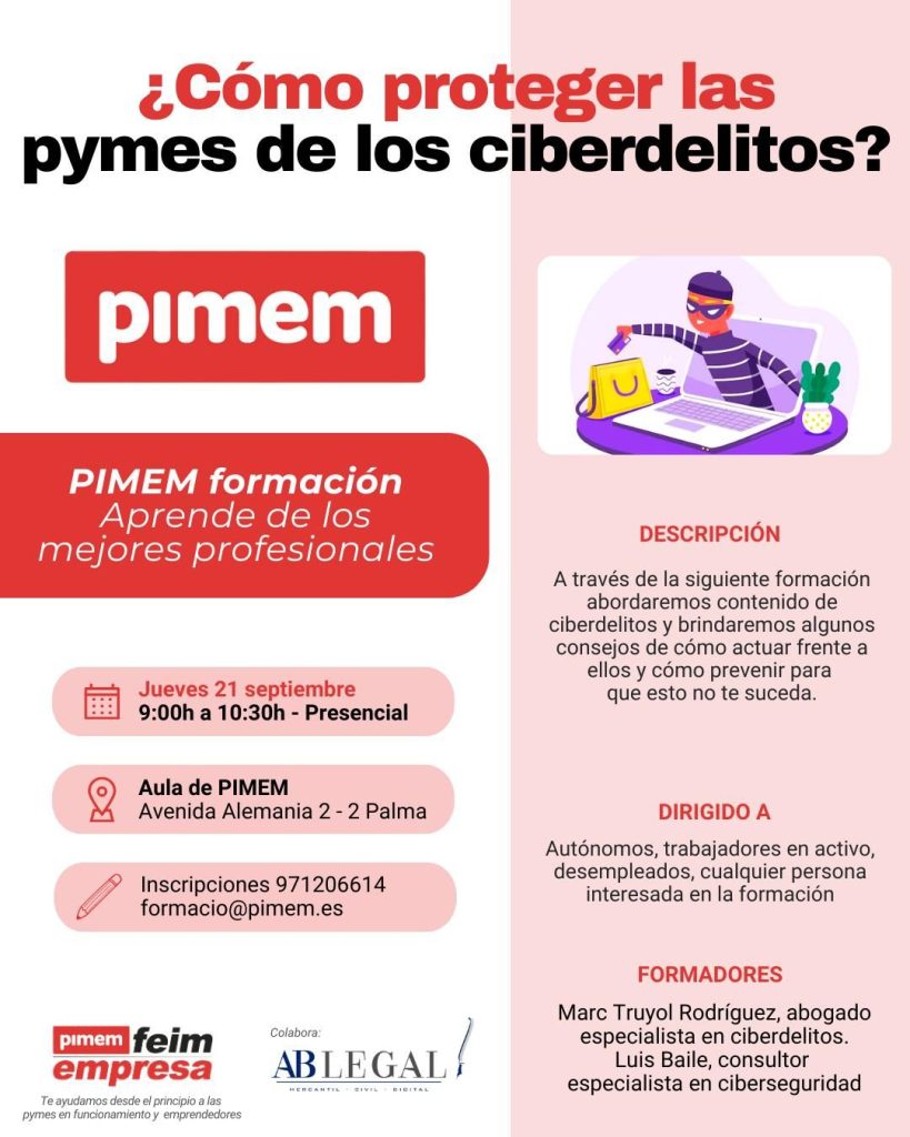El próximo jueves día 21 de septiembre de 9 a 10:30 horas, presencial en la sede de PIMEM (av. d’Alemanya, 2, 07003 Palma,) tendrá lugar la formación gratuita titulada “cómo proteger las pymes de los ciberdelitos”.